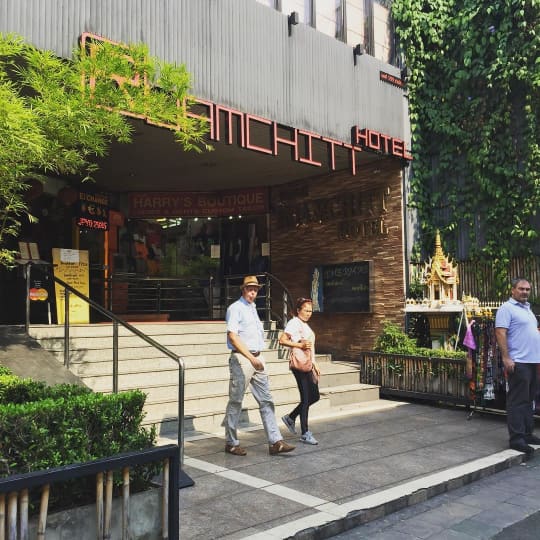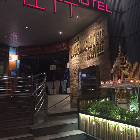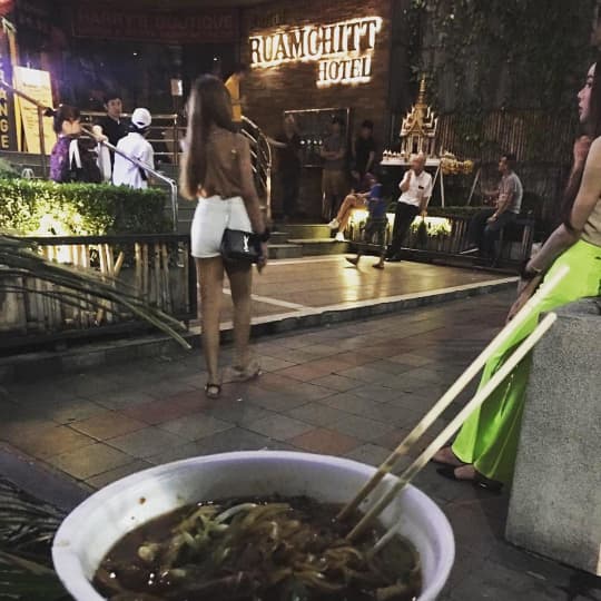 ルアムチット・プラザ・ホテルは昼間は目立ちませんが、夜は人だかりがしているので見つけやすいです。ホテル正面に向かって右の階段を地下に降りてください。