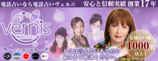 ヴェルニは1000人以上のプロ占い師が在籍し、雑誌・TVなどで活躍する全国の人気占い師との電話鑑定やメール鑑定が可能です。