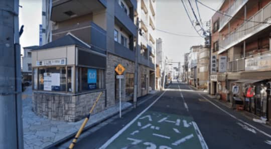 ここを三角屋根が見える建物の、左脇路地を真っすぐ突き当りまで進んでください。
