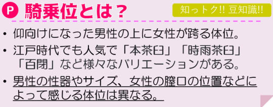 またバック同様に痛みを感じる女性も多く、「他の体位なら大丈夫なのに、騎乗位だけ痛い!」など。