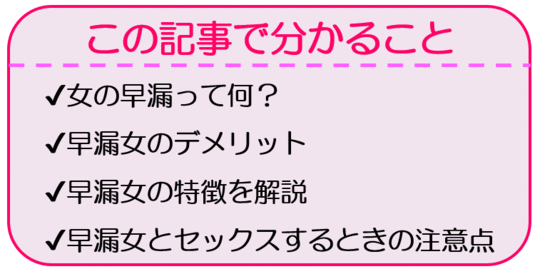 今回は、早漏女に関して特徴やデメリットを詳しくまとめ、体験談を紹介しました。