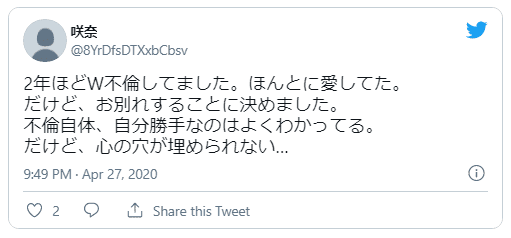 結局彼女は不倫相手と別れ旦那とも離婚しました。そして不倫相手も奥さんから家を追い出されたそうです。これがW不倫の代償ってことでしょうね。