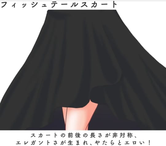 フィッシュテールスカートは、最近人気が高く前は短めで綺麗な足を見せつつ後ろは長めで足を隠す謙虚な見せ方が、男性からも色気を感じさせるアイテムの一つです!