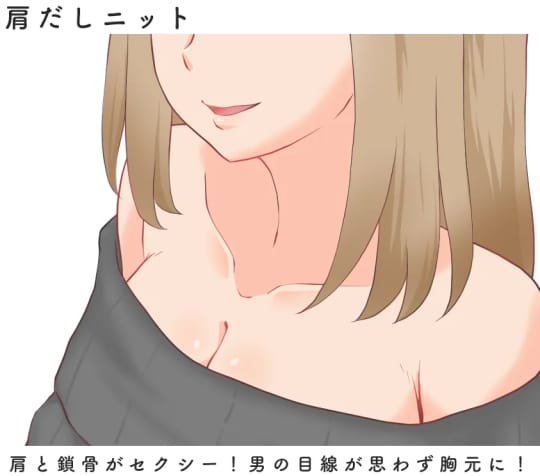 タイトニットは体のラインを出しつつ更に肩で生肌を感じさせ、ゆるふわニットでは可愛らしい中に肩が見えることで、ギャップ萌え効果があり男性の性の部分で印象を強く与えることができます。
