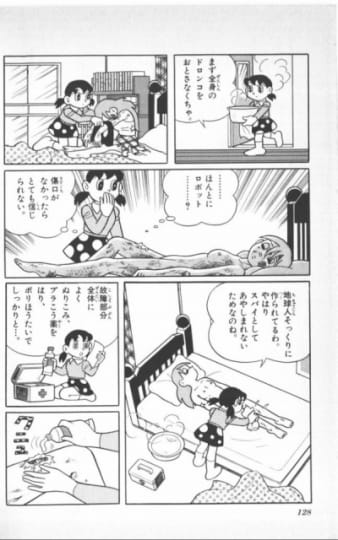 ロボットなので壊れてしまった所を、しずかちゃんが介抱するという有名なシーンなのですが、壊れた部分からロボットの部品が見え隠れするのがエロちっく。