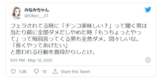 理由は「膣はほぼ同じ刺激だけど、フェラは舌や唇、手が変わった刺激を与えてくれるから気持ちいい」「自分じゃ予想できない刺激がくる」とのこと。