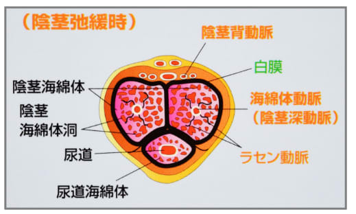 体内では一酸化窒素が放出され血管に血液が流れ込み、血液の圧力によって海綿体が硬くなります。