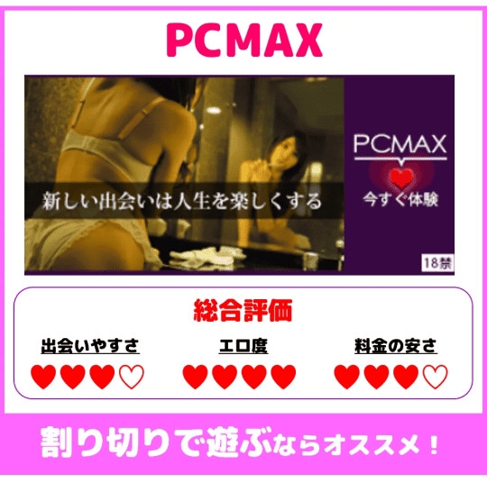 PCMAXは、コッソリ使うのに一番良い。お互い家庭持ちとかも多いから、秘密を守れる。(41歳/会社員)