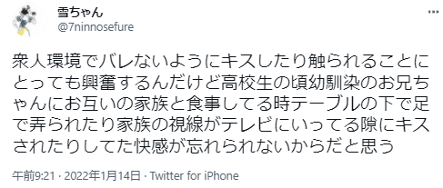 相手の幼い身体をみたことがあると、成長した身体に大人の色気を感じてしまい、ギャップが激しくて興奮しちゃうんです♡
