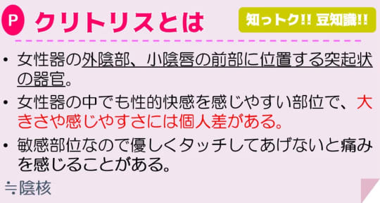 とても感度のいい部分ですから、無理矢理刺激してしまうと痛みを伴ってしまうこともありますから、様子を伺いながら気をつけて刺激してあげましょう。