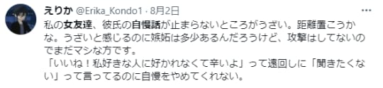 彼女は元々、彼氏のスペック自慢をすることで有名だったのですが…「こんなステータスの男と付き合える私、すごいでしょ?」というのが透けて見えてきつかったです。