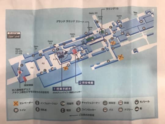 ANAのチェックインカウンターでもらえましたが、搭乗手続き→保管検査→空港ラウンジへのルートがわかりやすく表示されています。