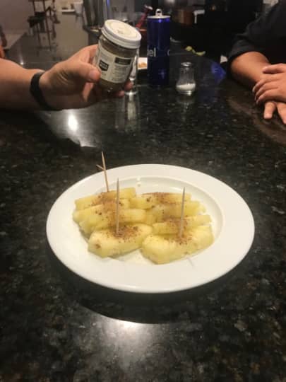 隣に座っていたメキシコ人とメキシコ人バーテンさんと仲良くなってテキーラを飲んでいたら、急にパイナップルが出てきました。パイナップルには何か調味料がかかっていてメキシコらしい独特な風味でした。