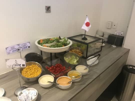 空港ラウンジ内はANAが直行便を飛ばすようになったからか、至るところに日本の国旗が飾られてて、食材にもANAのマークで英語とスペイン語、日本語で丁寧に案内されていました。