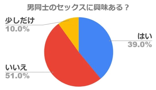男性100人に『男同士のセックスに興味があるのか?』を聞いてみたところ、なんと39パーセントもの男性が興味あり!との回答でした。意外と多いですね!