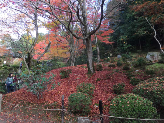 「瑞雲閣」で額縁庭園を堪能した後は、池泉回遊式庭園を歩いてみましょう。こんなに素晴らしい紅葉のじゅうたんに出会えますよ。